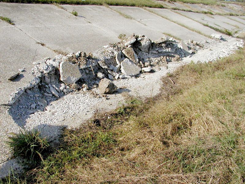 | This gash is 16" deep below the concrete. The thickness of concrete at this gash is 16". Each cement piece is 10' wide and this gash spanned 10 sections (100'). |