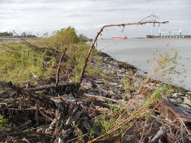 | Notice the real height of the Mississippi on the left side of the levee. On the right side of the levee, there is lots of driftwood. This indicates the river really did come over the top of the levee. We were very fortunate that this levee held. A man who stayed during Katrina said he saw the water coming over the top of the levee with all the driftwoood. He lives at the next curve of the levee in this picture. He didn't act like he wanted to stay again. |