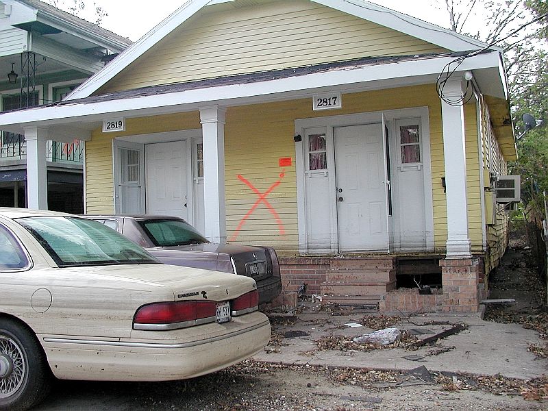 | A condemmed house near Carrolton Avenue. The ceiling had fallen and the house was moved off of its piers either by the flood or wind. | ||