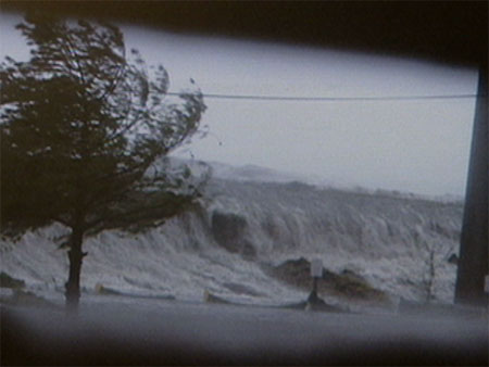 Massive waves crash over a floodwall near Michoud's Entergy plant near I-510.