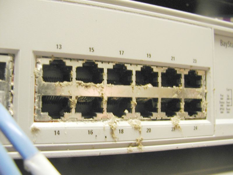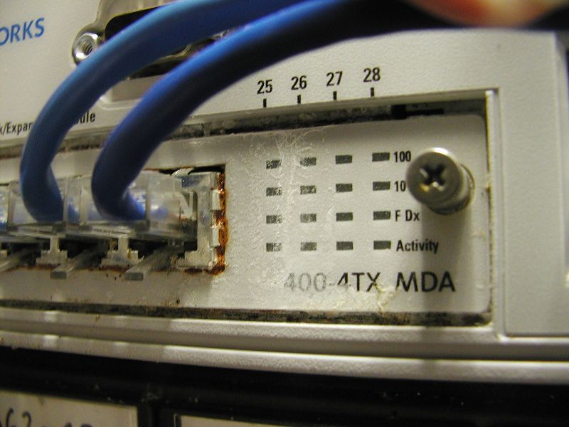 | A roof leak ruined network equipment. Notice the rust oozing from the connections. |
