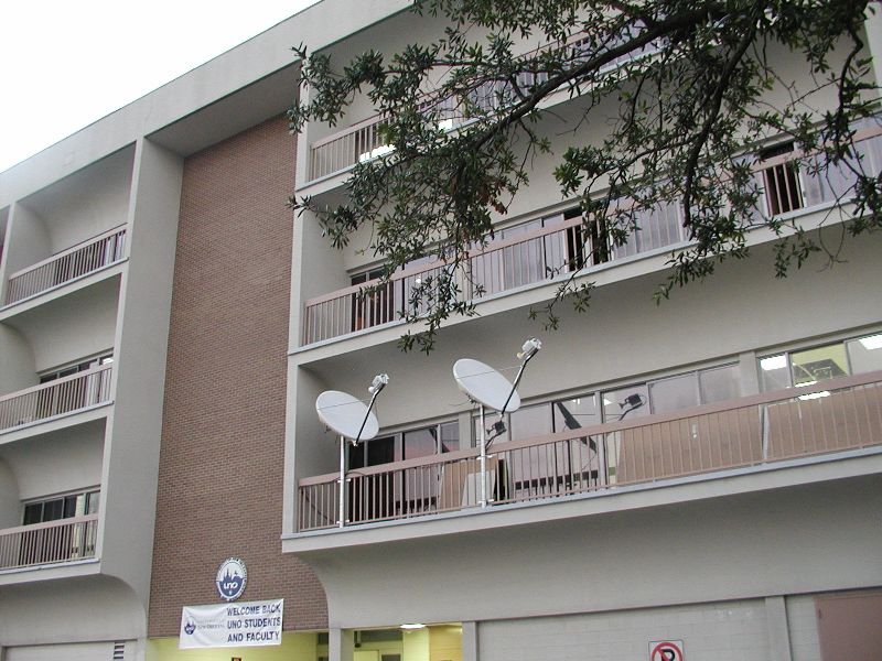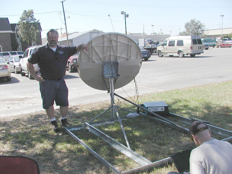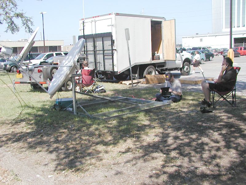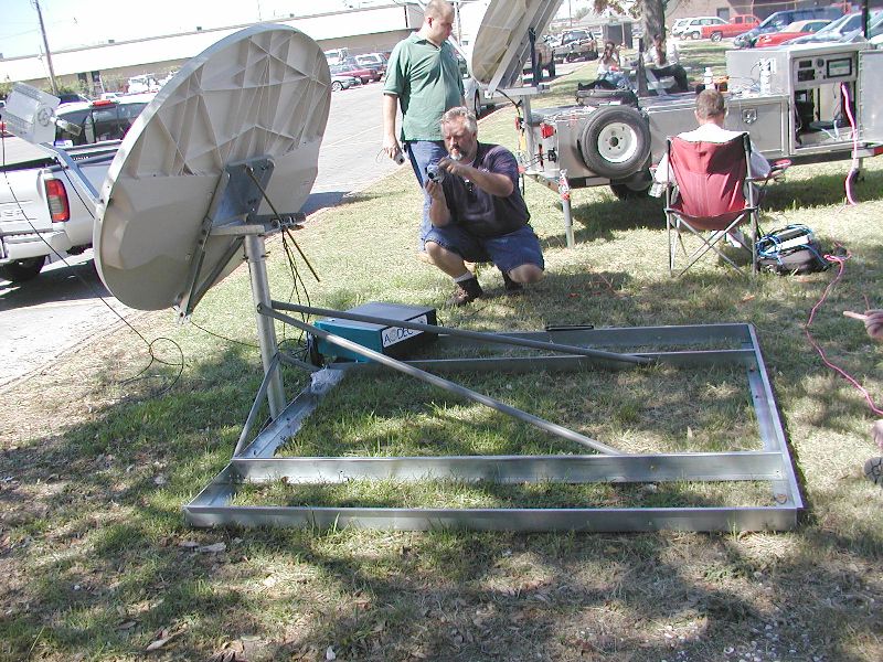 | The satelite dishes have arrived. Since we weren't allowed in the building, we set them up in the parking lot and discovered how to set them up and how they worked. |