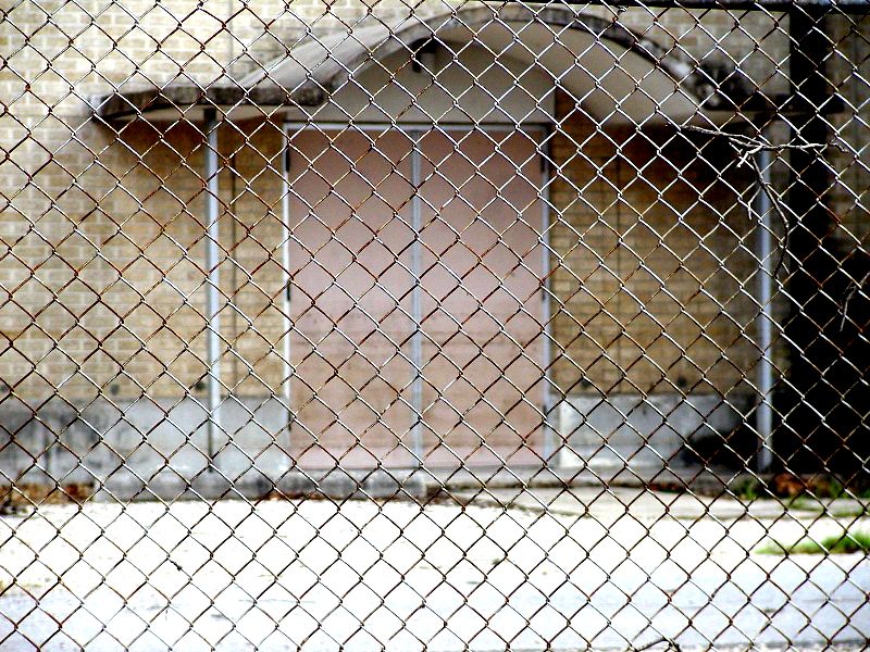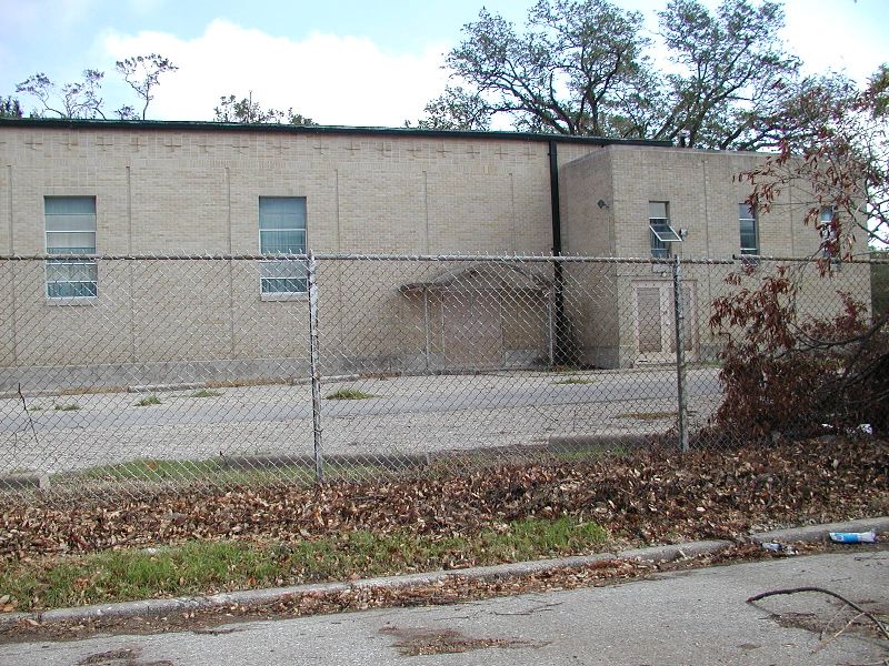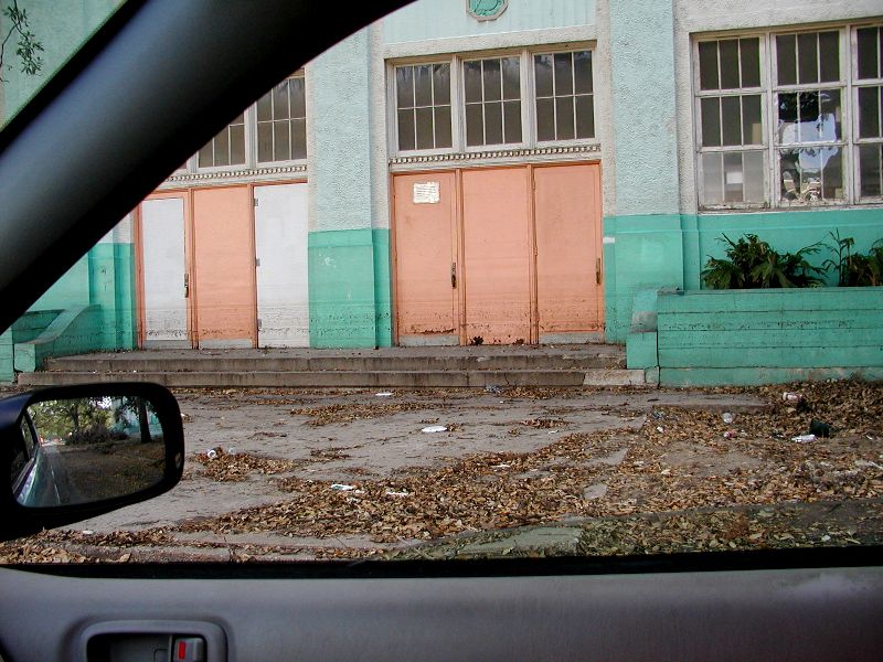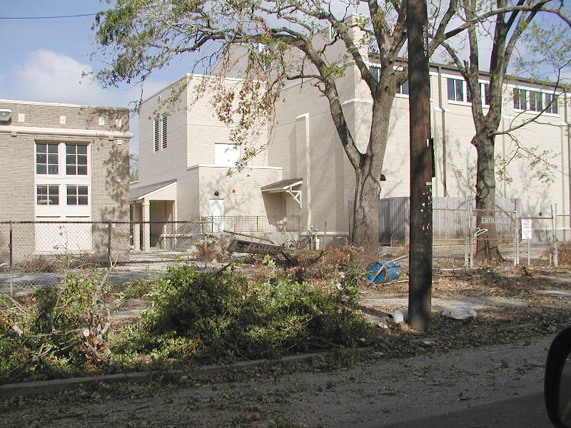 | McMain High School, across the street from Ursuline on Nashville Ave. The top water line is just above the door handles. Hurricane Rita which came with rain just a few weeks later, washed most of the top water lines off. |