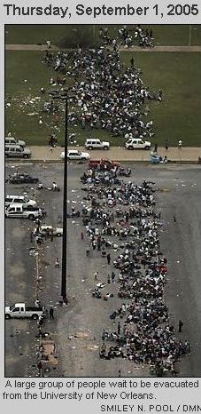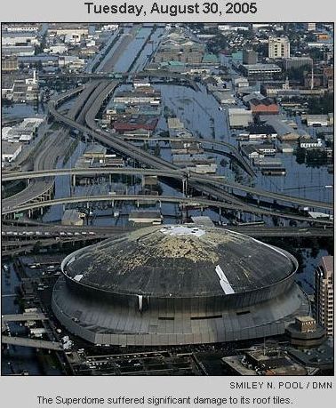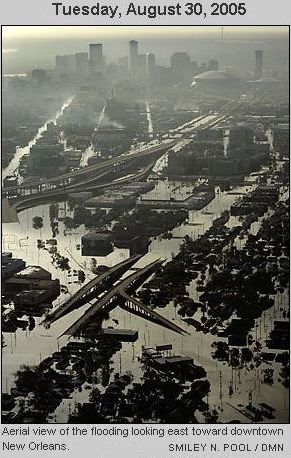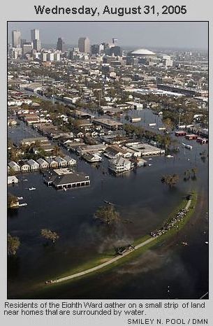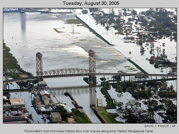 | Main levee break on Industrial Canal by St. Claude Bridge. If you know where to look, the barge that floated through the levee is just inside the break near the bridge. | ||