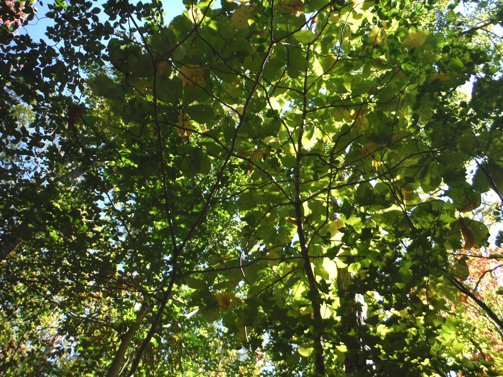 Looking up into the branches and leaves of a Paw Paw tree. | ||