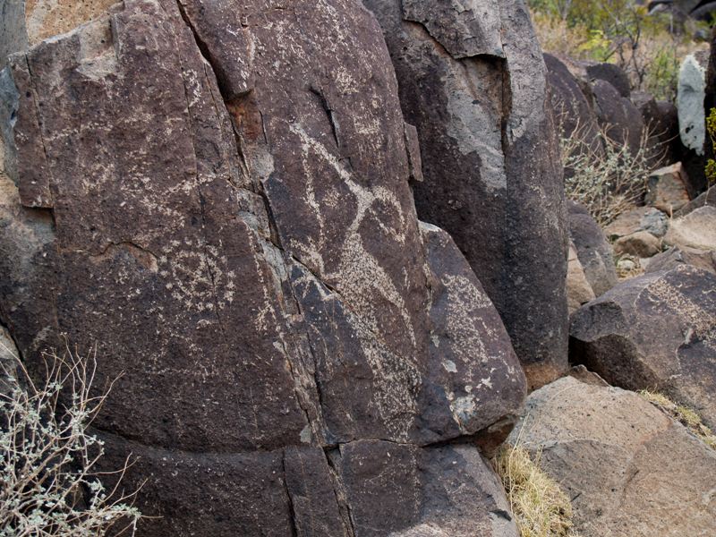 There are thousands of petroglyphs of people, animals, fish, insects, plants, and lots of abstract and geometric designs. The ones here date back to about 900 to 1400 AD. The dark patina on the rocks was taken off using stone tools by the Jornada Mogollon people to create the petroglyphs. |