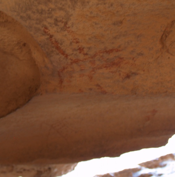 After the climb almost to the top, then you have to crawl/slither to see these pictographs. The camera bag in the next picture gives the crawl dimension.